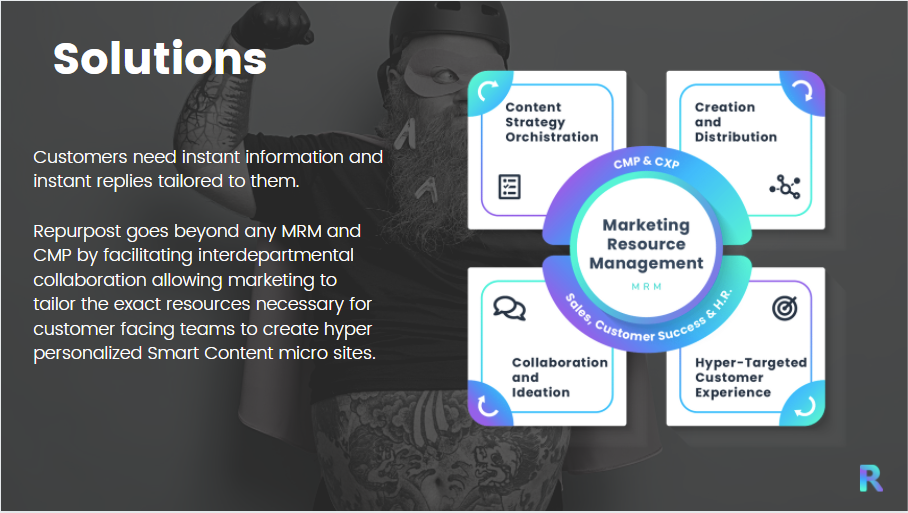 Repurpost is a Startup in the Martech sector. We provide companies with a SaaS platform where they can ideate, plan, organize, manage execute and deliver high-quality content and experiences that generate customer-centric engagement. Repurpost is organized into sections for the sake of simplicity, team collaboration, visibility and structure.